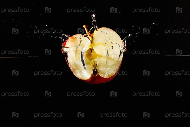 Половинка свежего яблока падает в воду со всплеском на черном фоне крупным планом
