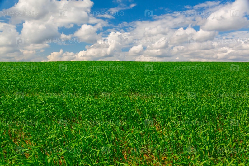 Зеленые агрокультуры на фоне голубого неба с облаками