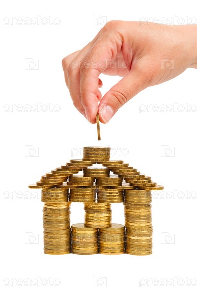 Женская рука складывает дом из монет, изолированная на белом фоне