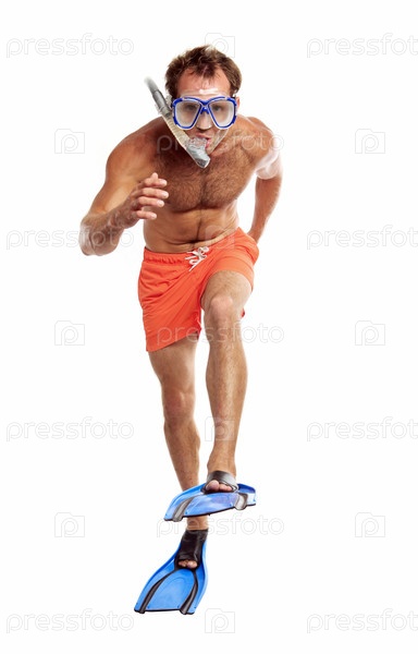 Европейский пловец с маской, трубкой и ластами на белом фоне