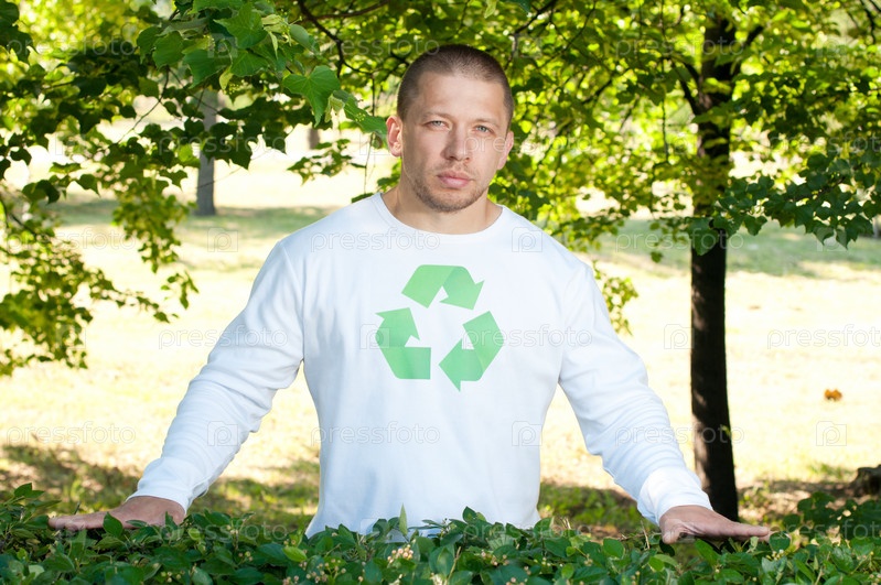 Эколог с символом повторной переработки на футболке стоит в парке