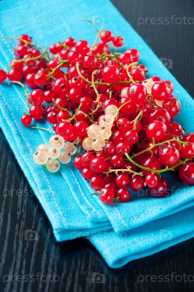 Красная смородина на бирюзовой салфетке, крупный план