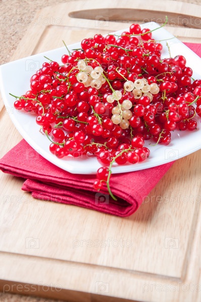 Тарелка с красной смородиной на деревянной доске