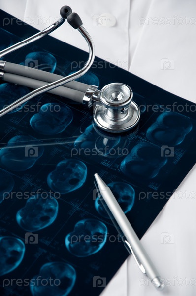 Томография: снимок МРТ, стетоскоп и ручка на докторском халате