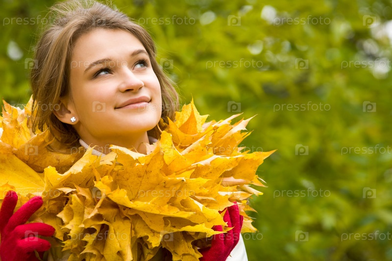 Очаровательная женщина в осенней обстановке, смотрящая вверх
