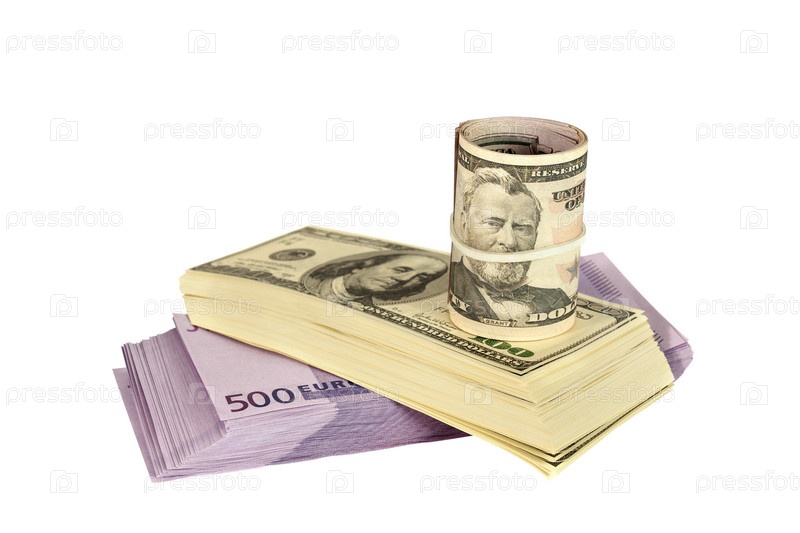 Стопки долларов и евро на белом фоне