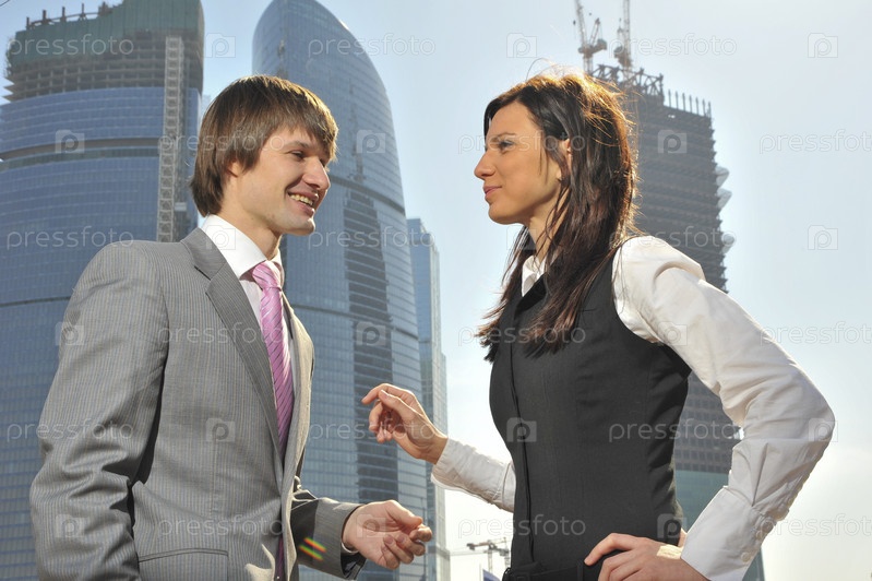 Молодые люди на фоне высотных офисных зданий
