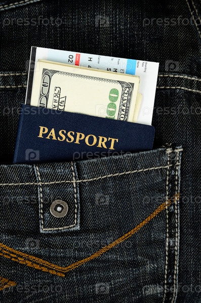 Паспорт США, деньги и посадочный талон в заднем кармане черных джинсов