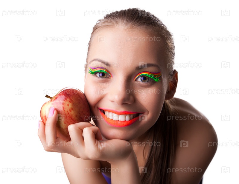 Портрет красивой женщины с красным яблоко м, изолированный на белом фоне