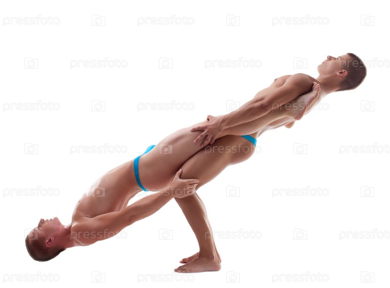 Два молодых сильных человека показывают гимнастическое шоу, изолированные на белом фоне