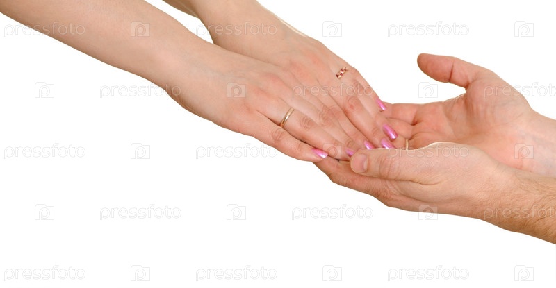 Мужские и женские руки на белом фоне