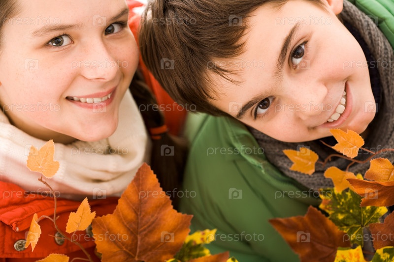 Счастливые братья и сестры с осенними листьями смотрят в камеру