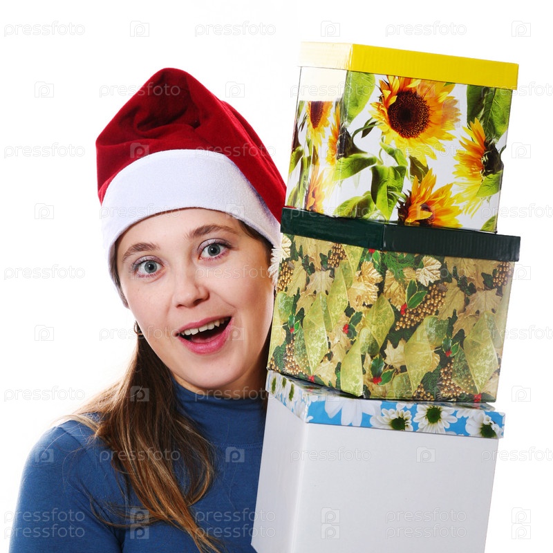Удивленная девушка в колпаке Санты с подарками