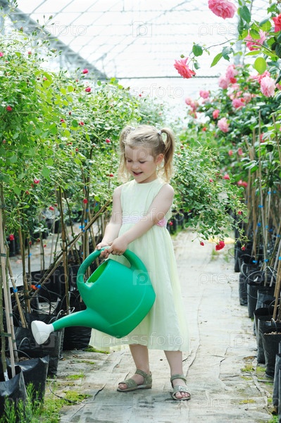 Хорошенькая девочка поливает цветы