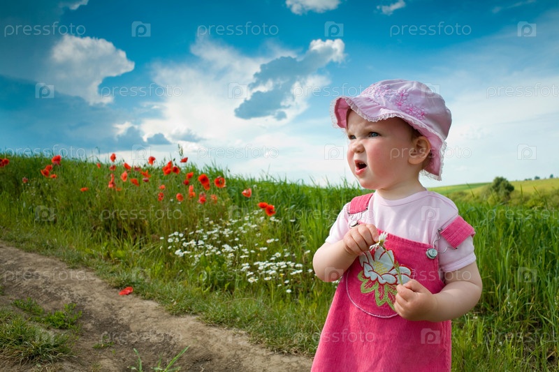 Симпатичная девочка на тропинке в зеленом поле