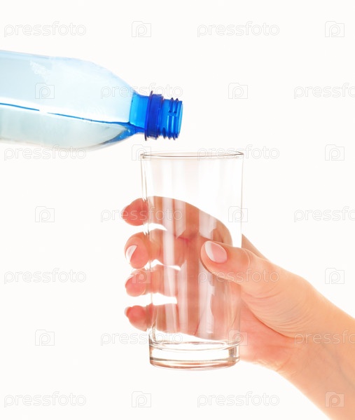 Рука с пустым стаканом и голубая бутылка чистой водой на белом фоне