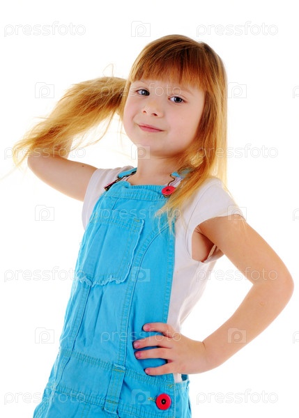 Маленькая девочка с длинными светлыми волосами на белом фоне