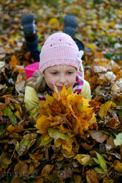 Маленькая девочка с желтыми листьями в парке