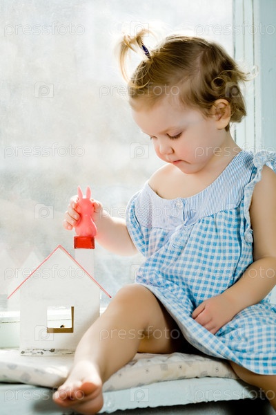 Ребенок с маленьким домом на окне