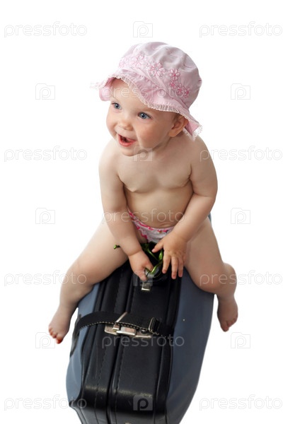Улыбающийся ребенок в панаме на чемодане