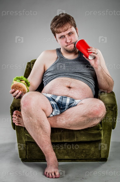 Толстый человек ест гамбургер, сидя на кресле