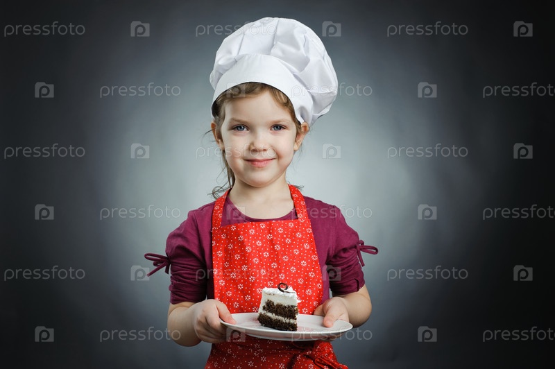 Девочка в белом колпаке с тортом на тарелке