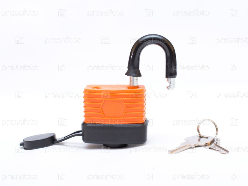 Замок, защищенный от проникновения влаги, с ключами на белом фоне