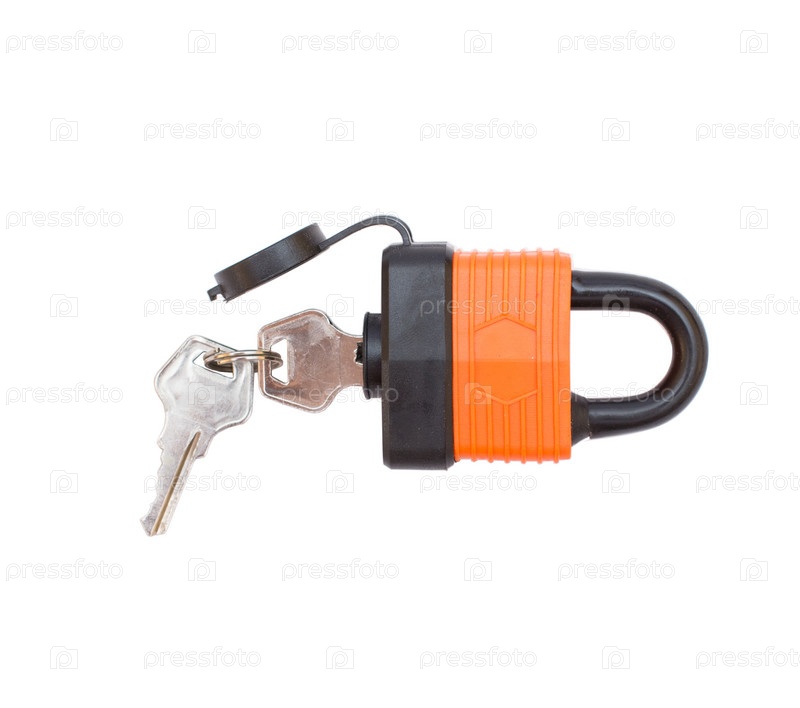 Замок, защищенный от проникновения влаги, с ключами на белом фоне