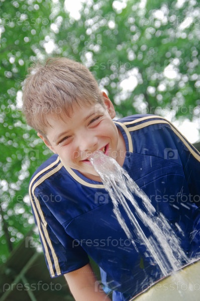 Улыбающийся мальчик пьет чистую воду из природного источника