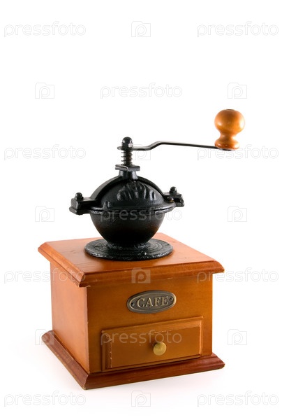 Традиционная деревянная кофейная мельница на белом фоне