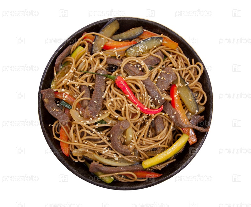 Гречневая лапша с говядиной в сковороде