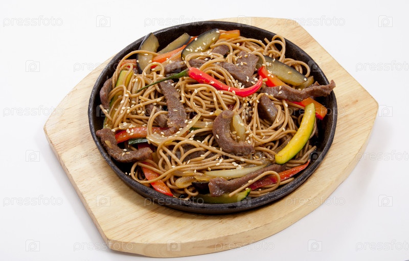 Гречневая лапша с говядиной в сковороде