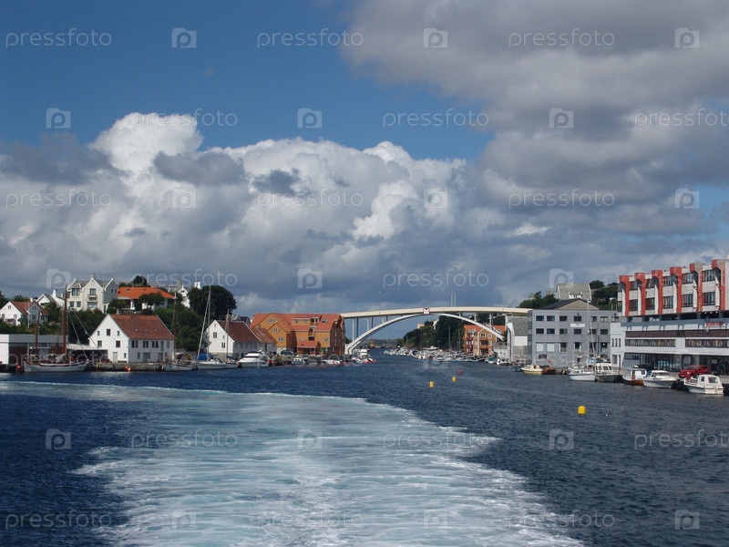 скандинавия. норвегия. Норвежское море. город Хаугесун. море .мост. вода .дом .