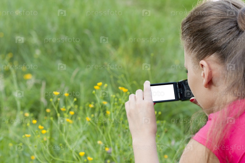 Красивая девушка с видеокамерой на природе