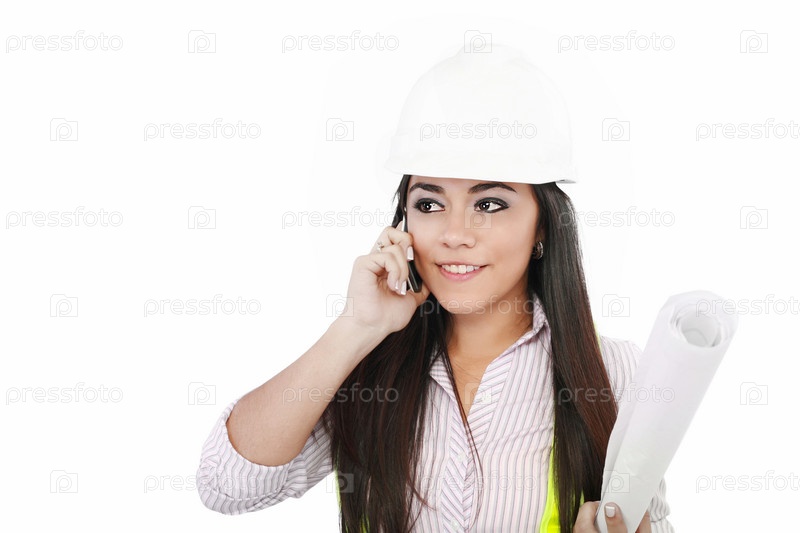 Красивая женщина держит чертежи и разговаривает по телефону