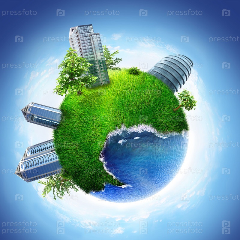 Здания и океан на зеленой планеты, концепция делового мира