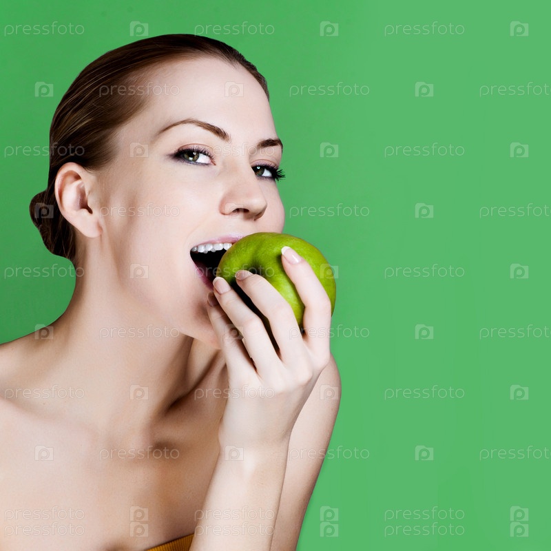 Женщина ест яблоко, улыбаясь на зеленом фоне. Здоровое питание