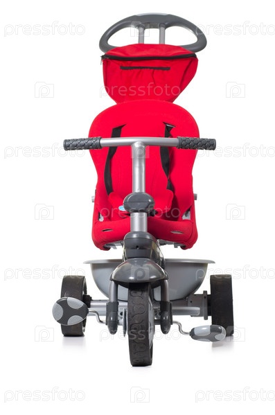 Красный трехколесный детскийвелосипед на белом фоне