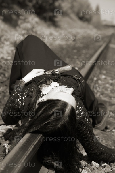 Молодая готическая девушка лежит на железной дороге