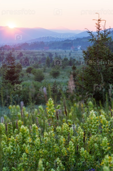 Красивый летний закат в горах с желтыми полевыми цветами на переднем плане
