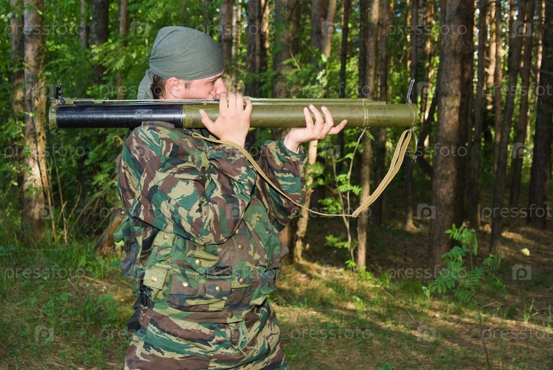 Молодой человек в камуфляже стреляет из гранатомета
