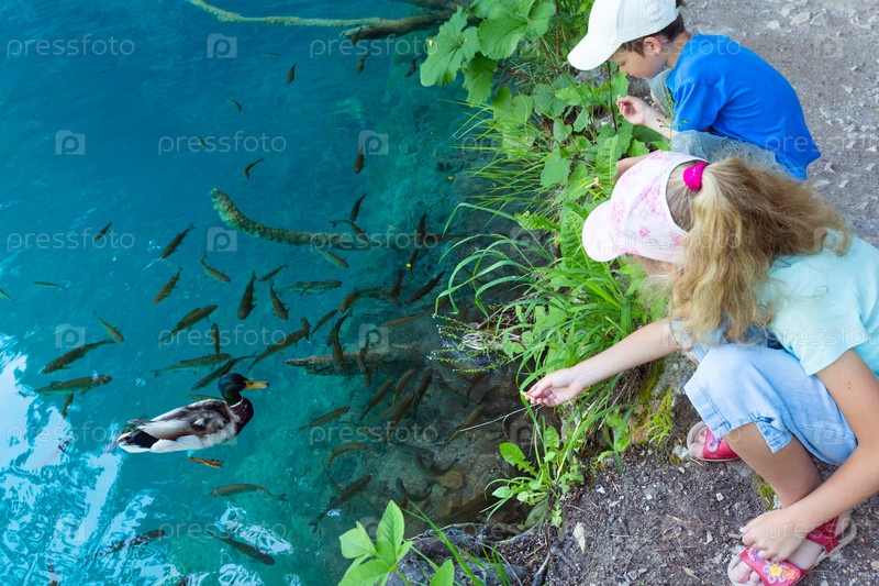 Двое детей кормят диких уток и мелких рыб в озере Лазурное