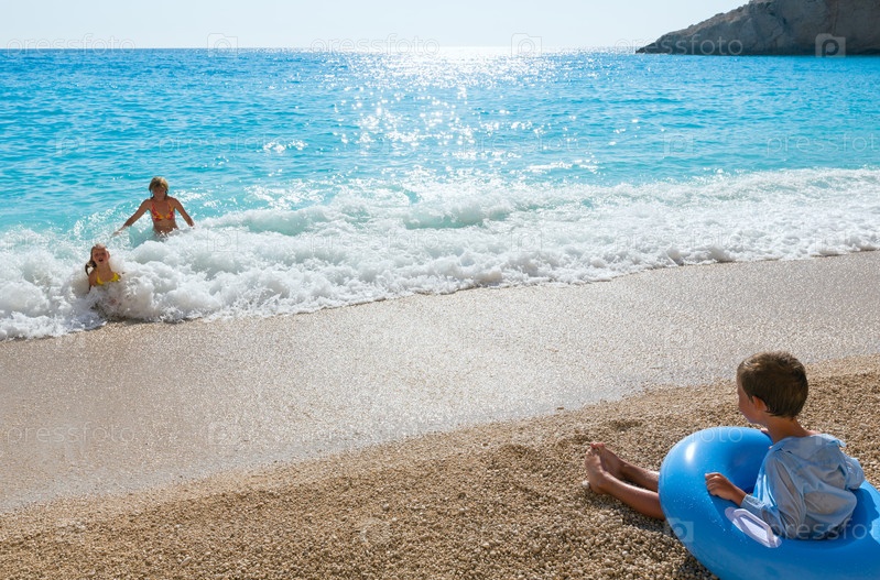 Мать с двумя детьми отдыхают у воды на белом пляже Эгремни, Ионическое море, Лефкас, Греция