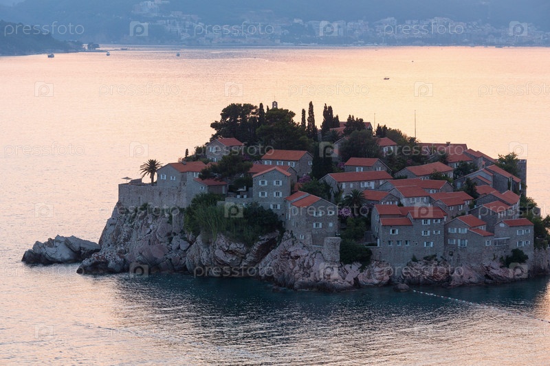Розовый закат и городской отель на островке Свети-Стефан в 6 км юго-восточнее города Будва, Черногория