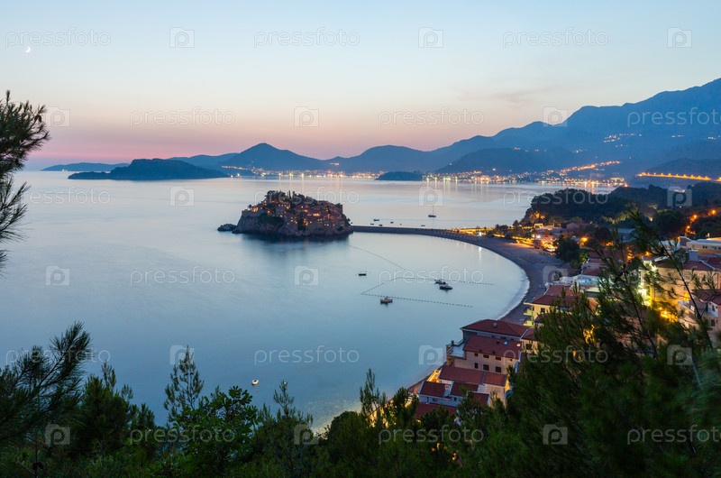 Вечер на островке Свети-Стефан в 6 км юго-восточнее города Будва, Черногория