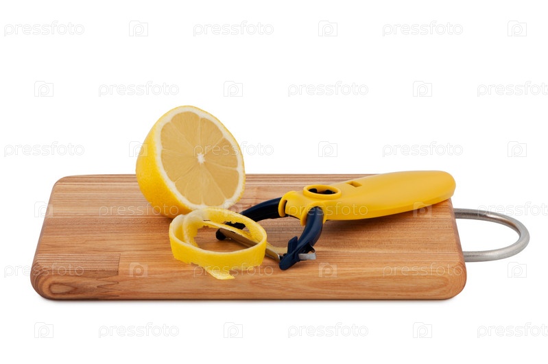 Цедра лимона, лимон и нож для чистки фруктов, изолированные на белом фоне