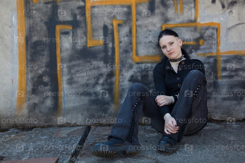 Молодая девушка в черном сидит перед стеной с граффити