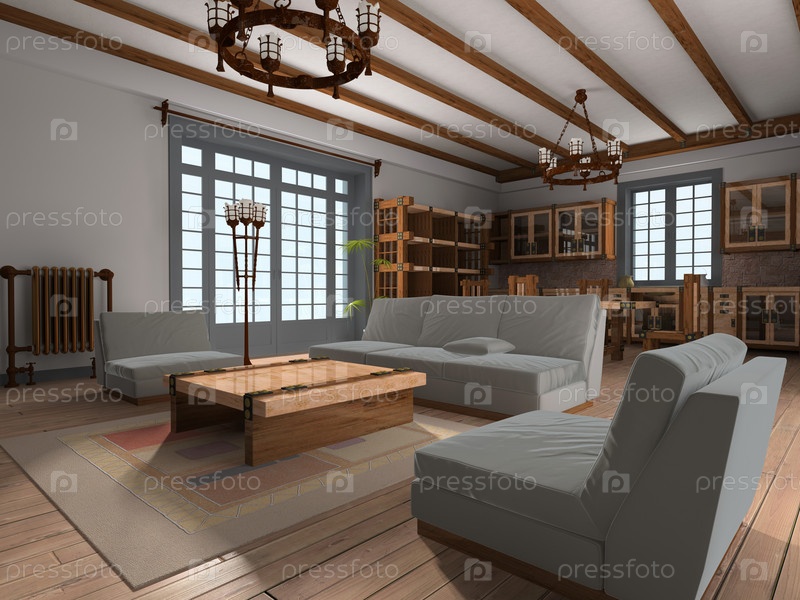 Интерьер комнаты с мебелью и кухонным гарнитуром