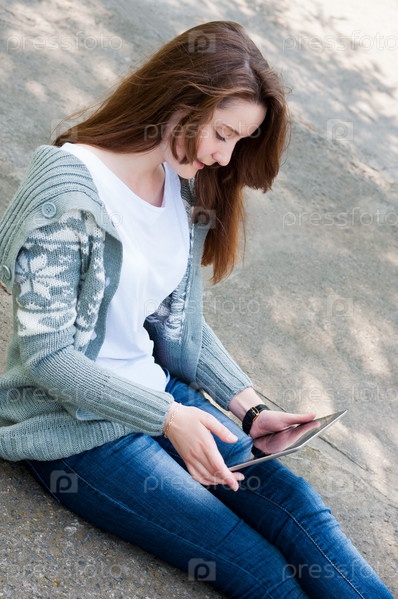 Девушка с планшктным компьютером сидит на бетоне