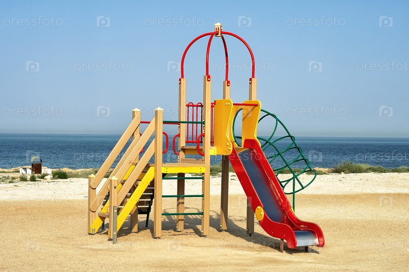 Яркая деревянная детская горка и игровая площадка на пустынном морском песчаном пляже в солнечный летний день